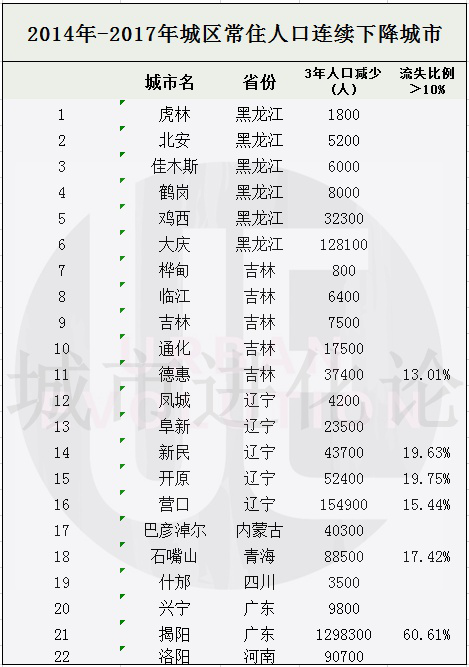 其中,有6座城市的城區常住人口三年流失率超過10%。只有位于東三省的12座“收縮型城市”,同步伴隨著人口密度連續三年下降。