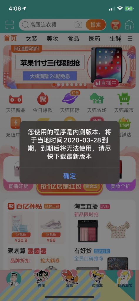 3月25日,手機淘寶iOS版本出現BUG,iPhone手機用戶打開淘寶APP后,會出現到期提示彈窗。彈窗顯示:您使用的程序是內測版本,將于當地時間2020-03-28到期,到期后將無法使用,請盡快下載最新版本。管道泵